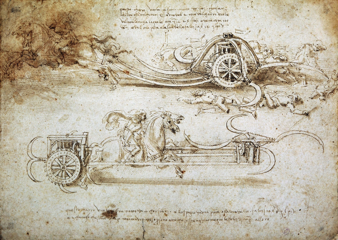 Immagine in apertura: LEONARDO DA VINCI, "Studi di carri d’assalto falcati", 1482-1485 circa. Penna e inchiostro, acquerello; 200 x 280 mm Torino, Biblioteca Reale, coll. Dis. It. 1/18 (inv. n. 155583 D.C.).
